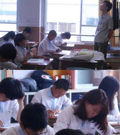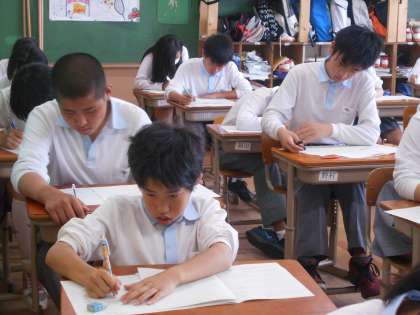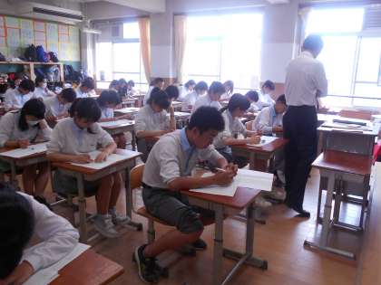 2組と3組の聞き取りテストでのようす。一生懸命聴き取っています。