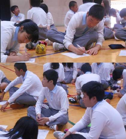 3年生は体育館で,学年道徳を行いました。授業者は3組担任の山内先生です。