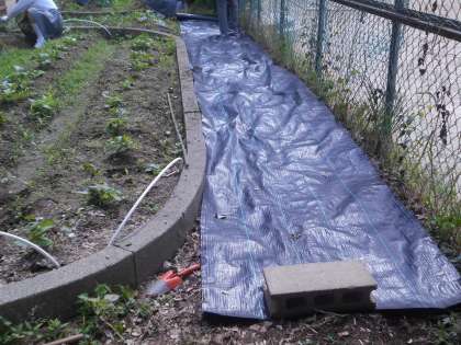 クワを使って回りの土を平らにしています。そこに雑草が伸びないように,黒い防草シートを敷きました。