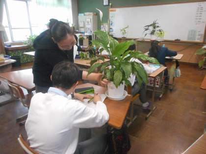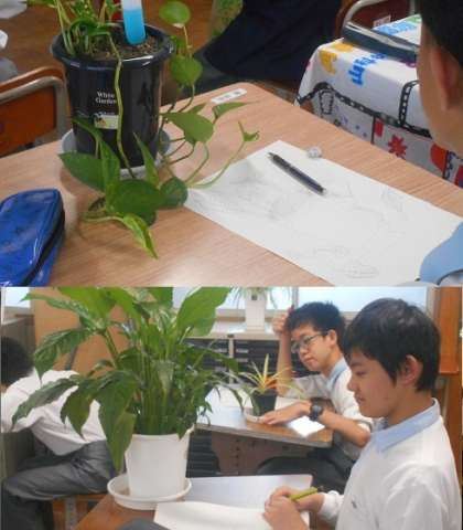 観葉植物をスケッチしています。葉脈まで細かく描いている人もいます。