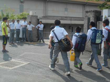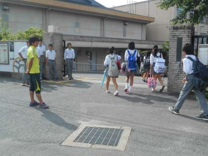 朝の登校のようすです。あいさつ運動の生活委員は3年生が当番です