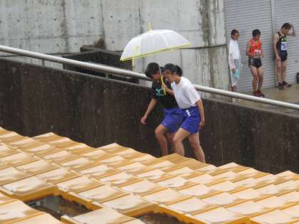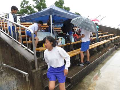 男女のリレーが行われる辺りから雨が強くなりテントや屋根の下の荷物も濡れるようになってきました。