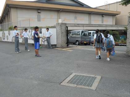 生活委員のあいさつ運動と女子バレー部と陸上部の朝掃除の様子です。