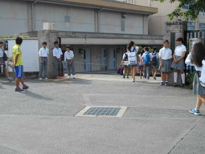 月曜日は1年生が当番です。朝のこの時間からすでに湿度は高く,気温も30度に迫っている中、元気に声をかけてくれています。