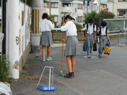 今朝も女子バレー部と陸上部が校門付近を掃除してくれています。