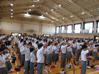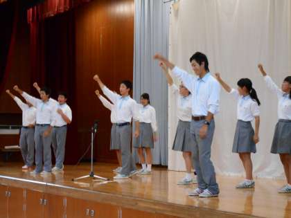 全校のシュプレヒコールの様子と生徒会長北村さんの閉会のあいさつです。