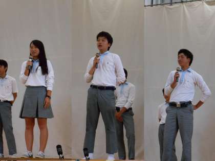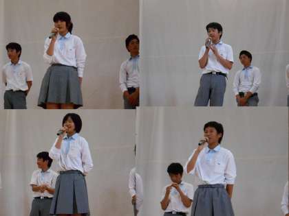 総会についての学校長の話の後,野球部、サッカー部、剣道部、陸上部、男子バスケット部、女子バスケット部、ソフトテニス部、女子バレー部、男子卓球部、女子卓球部のキャプテンが力強く決意を語ってくれました。