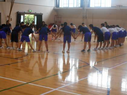 蒸し暑い体育館ですが,全体練習前のリラックスしたようすです。3年生を中心に笑顔でポーズを取ってくれるところがいいですね。勝負事では厳しいトーナメントを前に,こういう気持ちのゆとりも大切でしょうか。