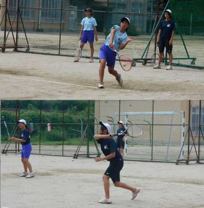 雨上がりのグラウンドでは女子テニス分が活動中です。明日からブロック予選が始まります。練習も3・3年生が中心です。