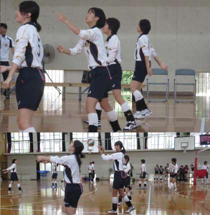 女子バレー部は1回戦で太秦中学と対戦しました。ウォーミングアップを終えて,いよいよ試合開始です。