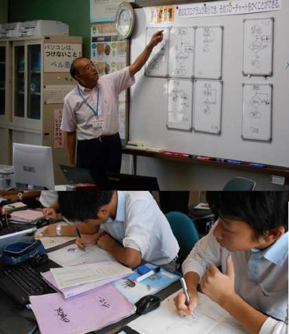 コンピューターを使って,コマを動かすプログラムをフローチャートに作る作業をしています。