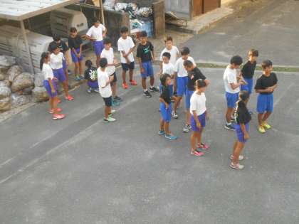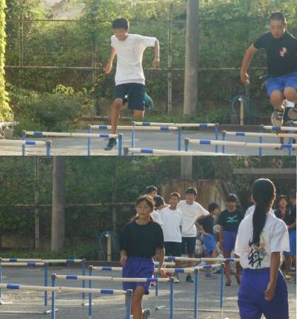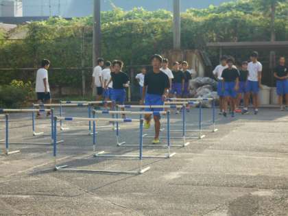 今日はグラウンドが使えない日ですが,中庭でハードルを使ってのトレーニングと後半は山科川の堤防をランニングします。