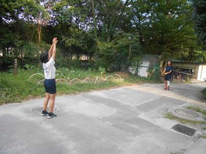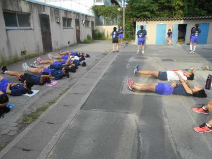 女子バレーもこれから抽選会が行われるようです。バレー部は今日は体育館の割り当てがないため,中庭でパスやトレーニングです。
