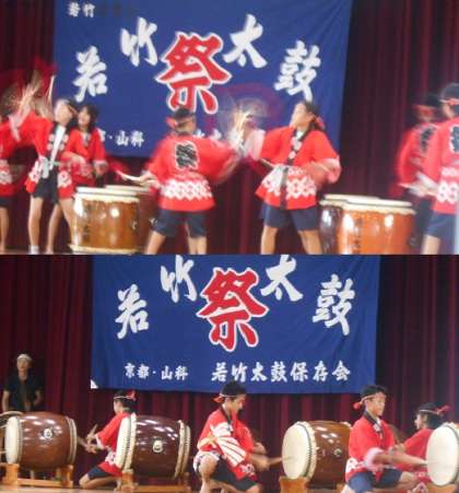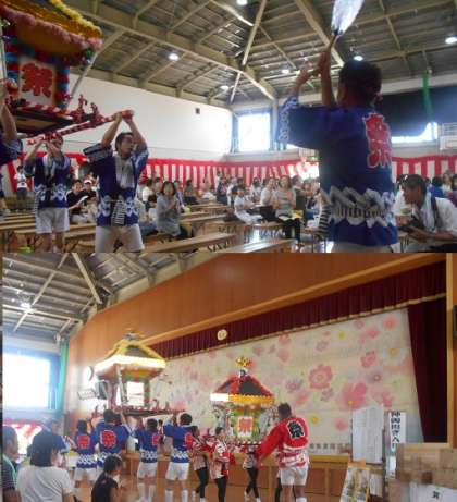 出し物の最初は,恒例の「御輿」で小学校のPTAの皆さんが担ぎ入れられました。続いてお馴染みの,若竹会の太鼓の演奏が行われました。
