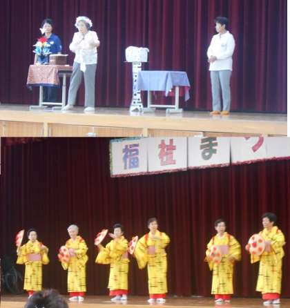 保健協議会の手品,老人クラブの踊り,小学校3年生の歌と出し物が続きました。後半も演歌やダンス,女性会の舞踏,児童館のダンスなど楽しく敬老会は進行しました。