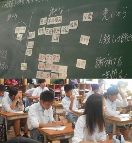 2年2組のようすです。テーマは同じ「償い」です。3組は全員が「許さない」でしたが,2組では「許せる」とした人も数名いました。どちらとも言えず線上に置いている人も。