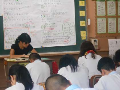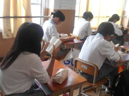 2年2組の朝の読書のようすです。黒板には合唱の朝練習で使った,「虎の巻」拡大版が残っています。