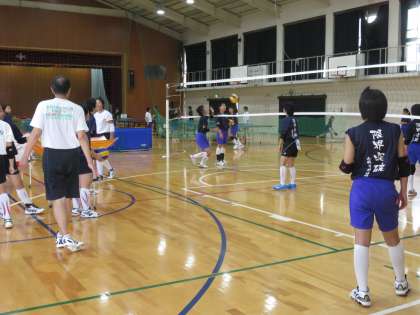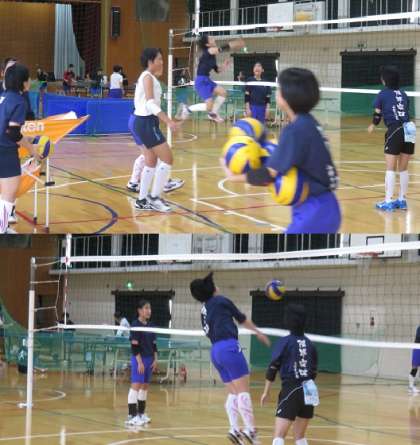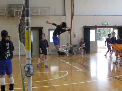 同じく体育館で,女子バレー部も練習中です。午前中は日曜の試合に備えて,女子バスケット部が練習をしていました。攻撃の練習ではアタックもよく決まっていました。