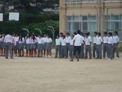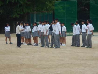 取組の時間、グラウンドで歌っているのは,1年5組と3年4組です。