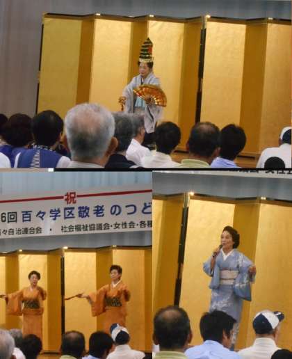 9月18日(日)百々学区の敬老のつどいに招かれました。長谷川社会福祉協議会長,柳生自治会長のあいさつの後,堀池山科区長からお祝いのあいさつがありました。
