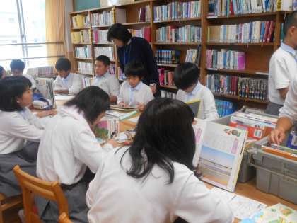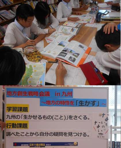 各グループに分かれて,九州地方の各県を,本を使って調べて言ってます。テーマは