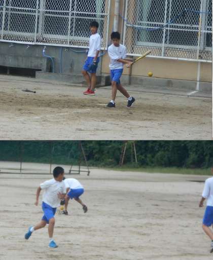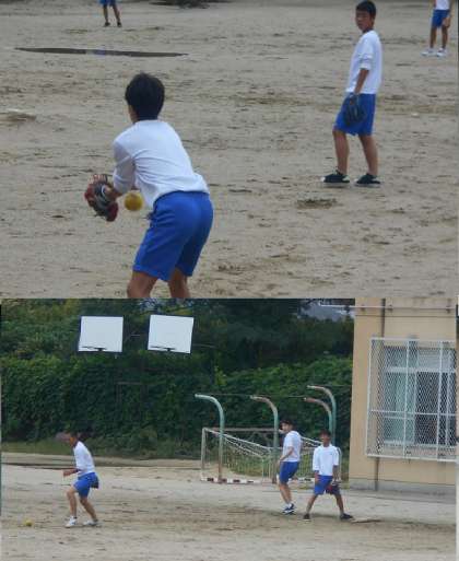 2年生の男子はソフトボールの授業です。とにかくバッターが打ってから,全員の動きがスタートします。緩い球なのですが,なかなかバットに当たらない場面もありますね。