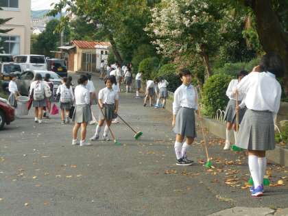 バレー部が前庭の落ち葉を掃いてくれています