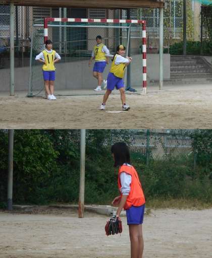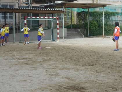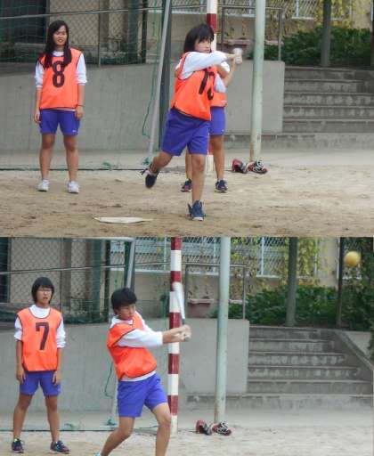 体育は女子がソフトボールです。キャッチボールをした後、ゲーム形式の活動ですが,なかなかバットがボールに当たらず,苦労ししています。