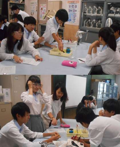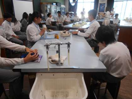 理科室での実験のようすです。今日は塩酸に電流が流れるときの変化を調べます。