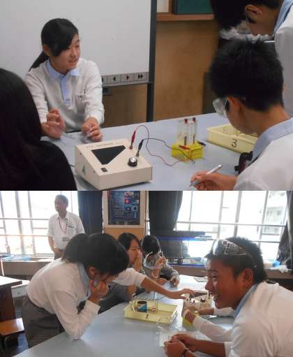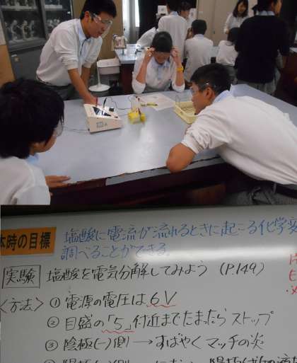 今日は教育委員会の主事の先生も来られていました。生徒たちはグループごとに実験を進めていきます。集めた気体にマッチの火を近づけると「ポン!」という大きな音がしました。