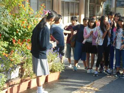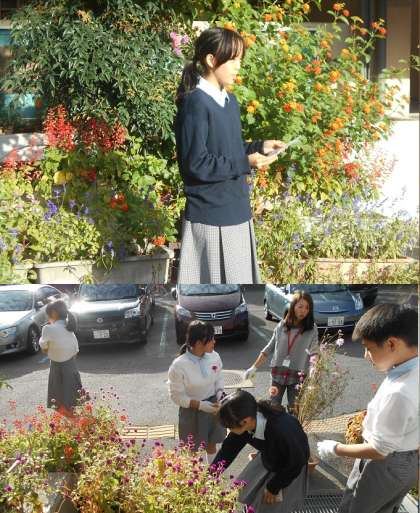 園芸部の活動のようすです。説明の時に花の髪飾りをつけるなど工夫しています。