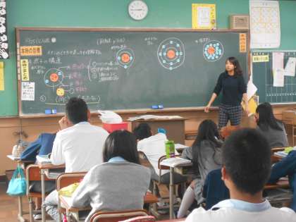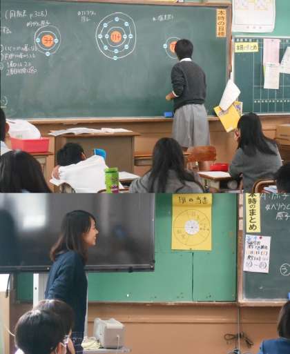 陽子と電子のモデルを黒板に貼って,生徒が構造をあらわそうとしています。