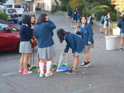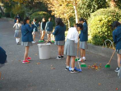 毎日のように桜の葉っぱが散りますが,部活動の邪魔になったりしないように、また、ご近所に迷惑にならないように,女子バレー部が頑張ってくれています。