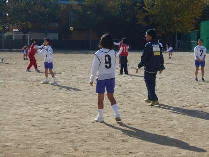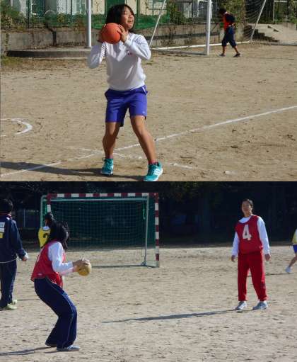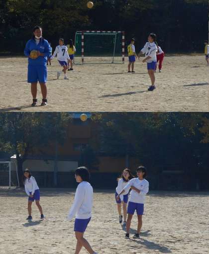 2年生の女子はハンドボールです。今日の時間は,ボールの正しい投げ方や動いてのパスの練習などです。