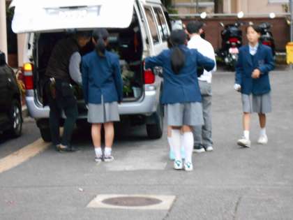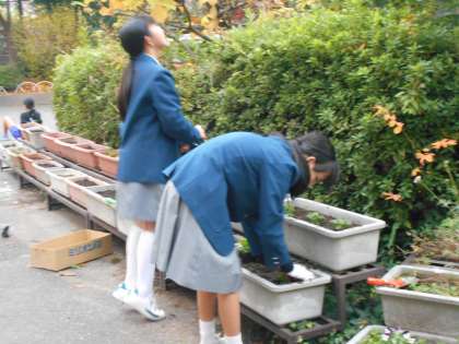 園芸部は卒業シーズンに向けて、サクラソウの苗を植えています。また、花の少ない季節なので,パンジーも植えてくれました。