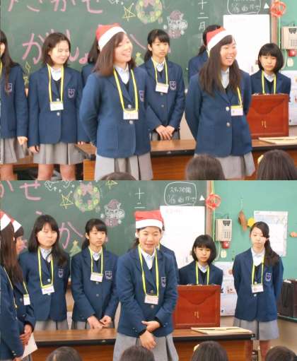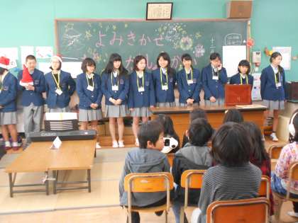 16日は図書委員会の2年生と合唱部の合同で,絵本の読み聞かせと音楽を届けに百々小学校を訪れました。最初にみんなであいさつをして,図書委員長からのあいさつの後、読み聞かせを始めました。