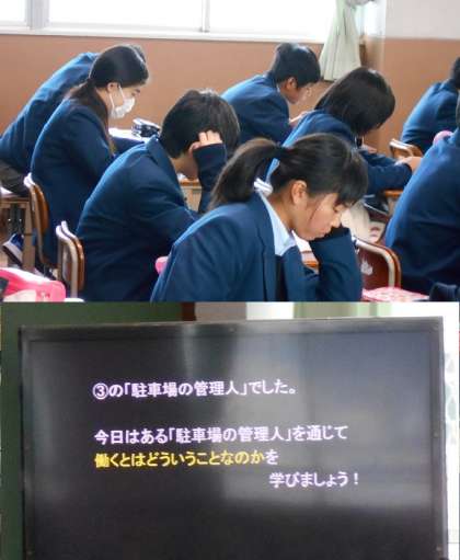 1年生は「人であふれた駐車場」という読み物資料を使っての道徳です。