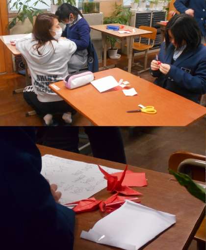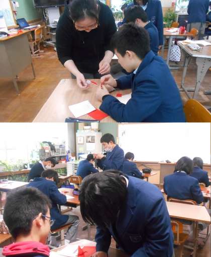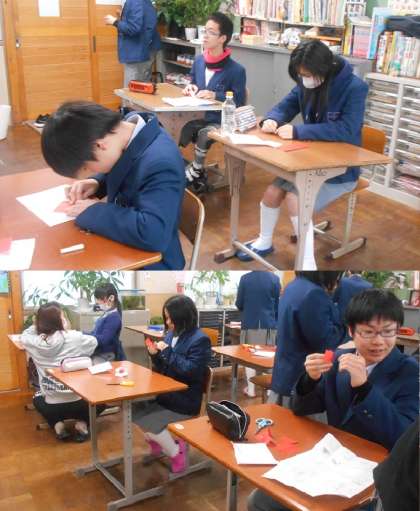 今日の美術では,次の作品に向けて,各自で「一工夫した鶴」を折っています。