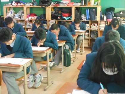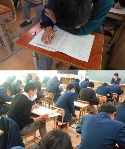 今日は学習確認プログラムの後半,理科と英語のテストです。英語のリスニングテストのあとの,2年4組のようすです。