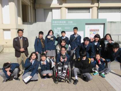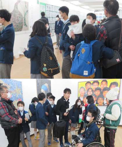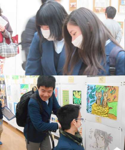 小学校の展示場所にも足を運んでいました。「後輩の作品はあるやろか?」「小学校の先生に会ったら恥ずかしいなぁ」などと言いながら,楽しそうに回っています。会場を出てから記念撮影をして帰路につきました。