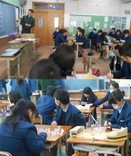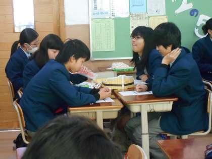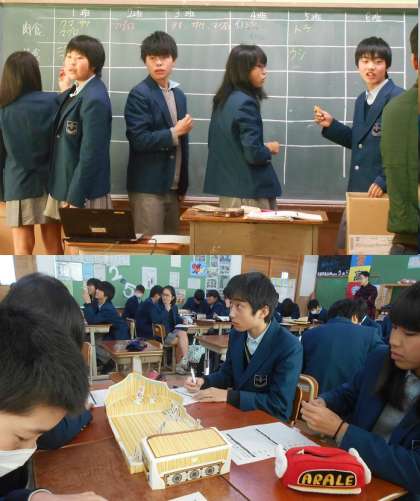 さまざまな動植物の中から,宇宙船に乗せるものを12選びます。各班で考えたものを黒板に発表しています。