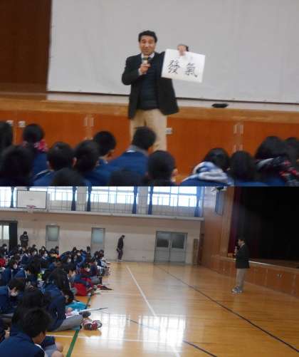 私からは,ちょうど稀勢の里が日本出身横綱としては,19年振りで大きな話題になったので,相撲の行司の人が土俵の上でかけるかけ声から受験について話をしました。紙に書いてある字は「發氣揚揚」=「はっけよい」の語源と言われる言葉です。