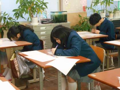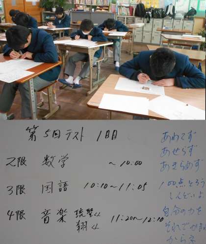 8組の1時間目は数学のテストです。1・2年生の10人がテストを受けています。3年生は体育館で式の練習に参加しています。