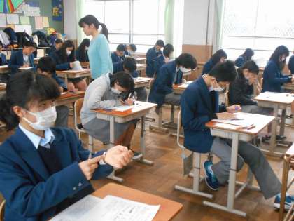 1年4組の英語のテストです。ちょうど先生が解説に来られました。