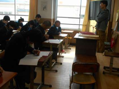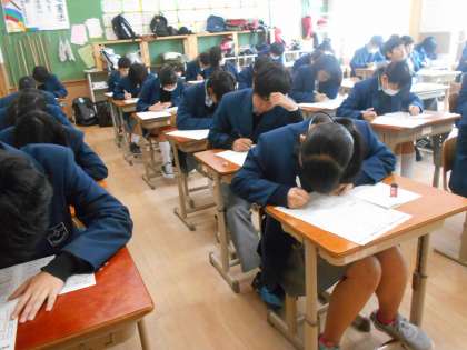 保健体育のテスト、3組の様子です。倒立前転、開脚前転などの語句をひらがなで覚えると答えを迷うようで,「珍答?」がたくさんありました。漢字で覚えている人はしっかり書けているようでした。