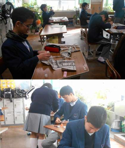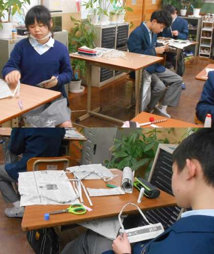 丸めた新聞紙を短くしてバッグの取っ手にして,紙で手提げバッグを作っています。