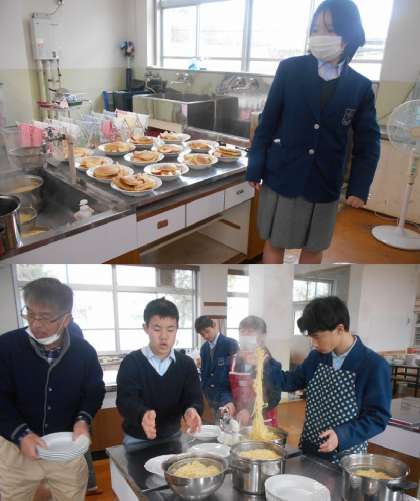 料理(スパゲッティとパンケーキ,フルーツ)が完成し,いよいよ8組の送る会です。