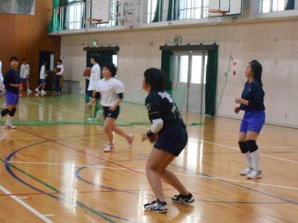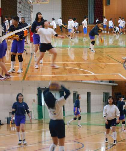 体育館では女子バレー部と男子バスケット部が練習です。どちらも人数が多く声も良く出るので,大迫力です。