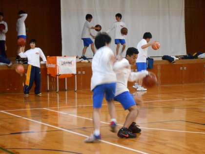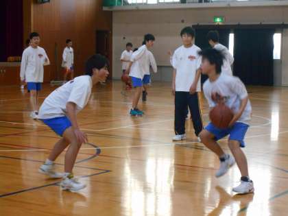 体育館での男子バスケット部の練習の様子です。声も良く出て元気一杯です。