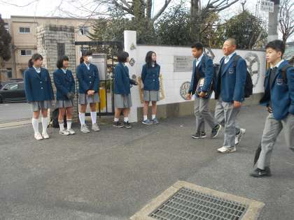 なぜか校門の両脇に,男女で分かれてあいさつをしています。